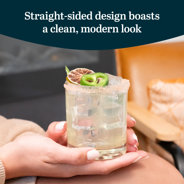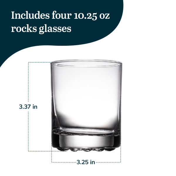 Libbey Aspen Old Fashioned Whiskey Glasses Set: Add a touch of sophistication to trays, countertops, and bar setups with this cocktail glass set. Each double rocks glass holds 10.5 ounces and features a double old-fashioned silhouette suitable for whiskey, cocktails, or everyday beverages. Crafted from fine-quality clear glass, the scotch glasses set 4 has a modern profile with clean lines. The base of these everyday glasses includes a retro, bubble-like texture that provides grip on smooth or wet surfaces, helping reduce slippage. A thick sham adds weight and balance to each bar glass, while the chip-resistant Safedge rim enhances durability for frequent use. This design offers both style and resilience in a compact form. These short cocktail glasses are dishwasher safe and easy to care for. Regular handling and gentle maintenance help preserve their clarity and structure over time. Suitable for cocktails, rum, iced tea, water, and more, this set of 4 whiskey cups is a versatile addition to any home bar or kitchen glassware collection.