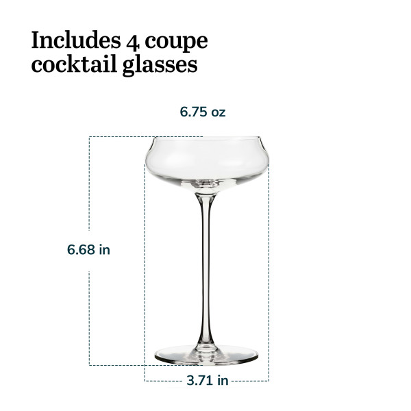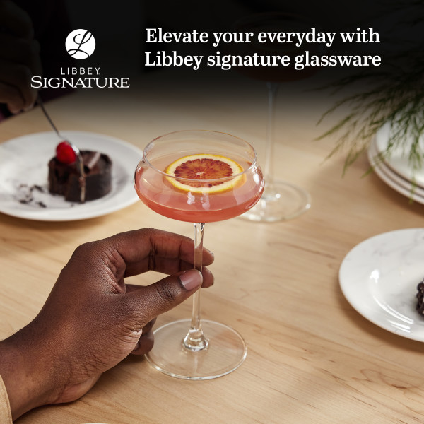 Libbey Signature Stratford Coupe Cocktail Glass Set of 4: Experience a wine glass like never before with the Libbey Signature Stratford cocktail glasses with stem. These 6.75-ounce alcohol glasses elevate fine wines and cocktails to dazzling heights with their artfully curved bowls that exude lavish luxury. This unique elegant wine glasses collection features flavor-enhancing tapered rims and wide bowls, designed to encourage effortless swirling and enhance aeration, aroma, and flavor. As a highlight of the Libbey Signature collection, Stratford fancy cocktail glasses are meticulously engineered to perfection, delivering an exceptional wine-drinking experience. Our coupe champagne glasses set of 4 is a beautiful way to serve sparkling beverages and cocktails. The modern glassware has a comfortable design that allows you to swirl your drink without worrying about spills. At the same time, the seamless pulled stem and refined flat foot provide aesthetic appeal and durability. Crafted in the USA for maximum clarity and brilliance, each cute wine glass in this set features the Libbey Signature laser mark on the bottom, signifying superior quality and craftsmanship. Product dimensions are 3.7” x 3.7” x 6.7”, and the bar glassware is perfect for bachelorette parties, housewarmings, anniversaries, birthdays, and cocktail parties; these elegant coupe glasses elevate any event.
