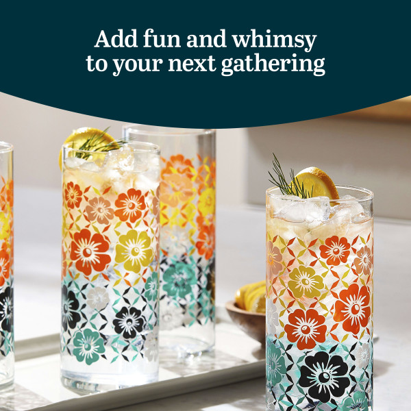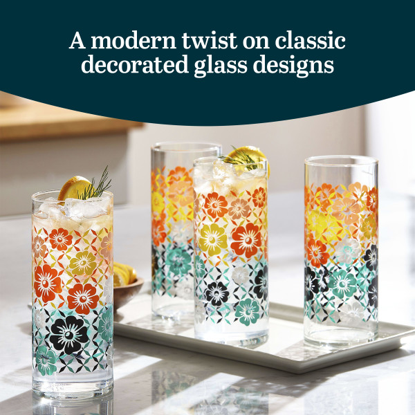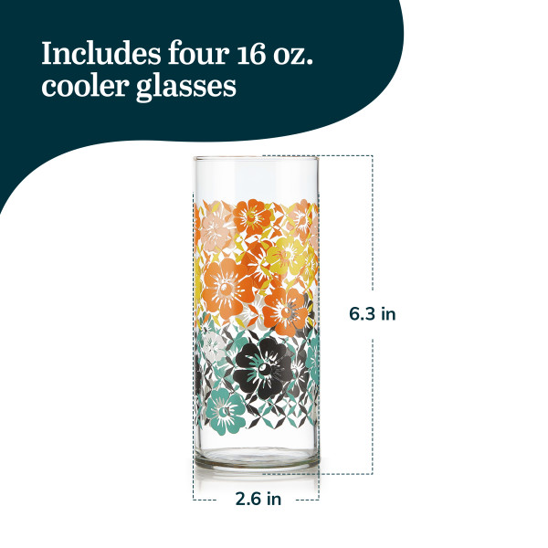 Libbey Vintage Flower Glasses Drinking Set: This midcentury meets modern glasses set pays homage to the Flower Power era with our Libbey vintage glass cups set. This charming glassware drinking glasses set includes four tall 16 ounce cooler glasses. Crafted from quality glass, this textured drinking glasses set features bold colors and retro patterns with rich pops of orange, yellow, and mint. Each sip from these dinner glasses will add fun and whimsy to your next gathering – or just bring a blast from the past . Relish the vintage charm every time you use these everyday drinking glasses set. These beverage glasses are ideal for everyday beverages like water and juice and perfect for serving tea or lemonade to guests, making every gathering feel special. The Libbey Vintage mixed drink glasses offer a modern twist on the classic decorated glass designs of the 60s and 70s. The bright, nostalgic styles add a mix-and-match appeal to your tabletop, enhancing your dining experience. Enjoy the convenience of easy cleaning with these dishwasher safe glasses. The colors remain vibrant even after multiple washes, although hand washing is recommended to preserve their beauty for years.