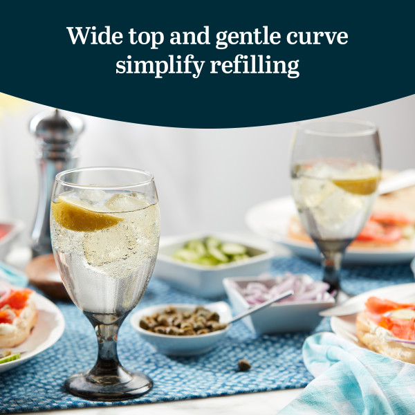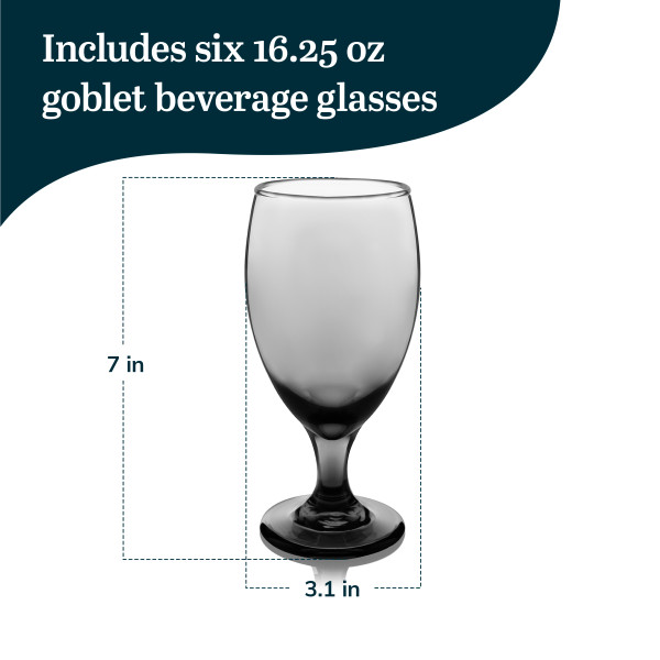 Libbey Set of 6 Goblets for Party: The Classic Smoke 6-piece clear goblets bring a touch of sophistication to your gatherings, recalling a classier time with its rich infusion of color. Each of these wedding goblets is designed for both style and function, featuring a balanced weight that makes it comfortable to hold. The wide top and gentle curve of the goblet glasses for cocktails allow for easy refilling, making hosting seamless while keeping the fun going. The timeless design, clean lines, and infused color of these unique goblet drink glasses create an enduring, elegant look that will impress your guests and enhance any table setting. With an iconic shape, this goblet cocktail glass set promises to remain in style for years, elevating your glassware collection with a classy upgrade. The dishwasher-safe wine glasses include six 16.25-ounce smoke-colored goblet glasses that are durable and dishwasher-safe for quick and easy cleanup. Each goblet glassware set of 6 measures 3.1 x 3.1 x 7.0 inches, making it a perfect fit for any occasion while preserving its elegant appearance with ease.