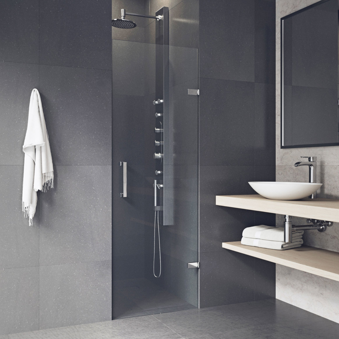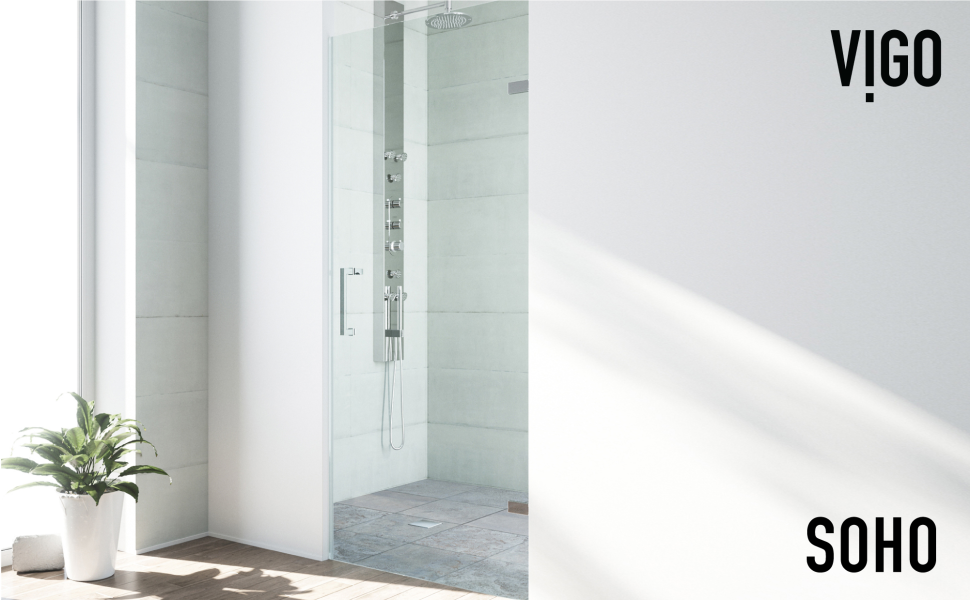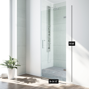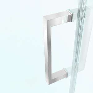 A square door handle and matching square hinges add visual dimension to this unique shower door.