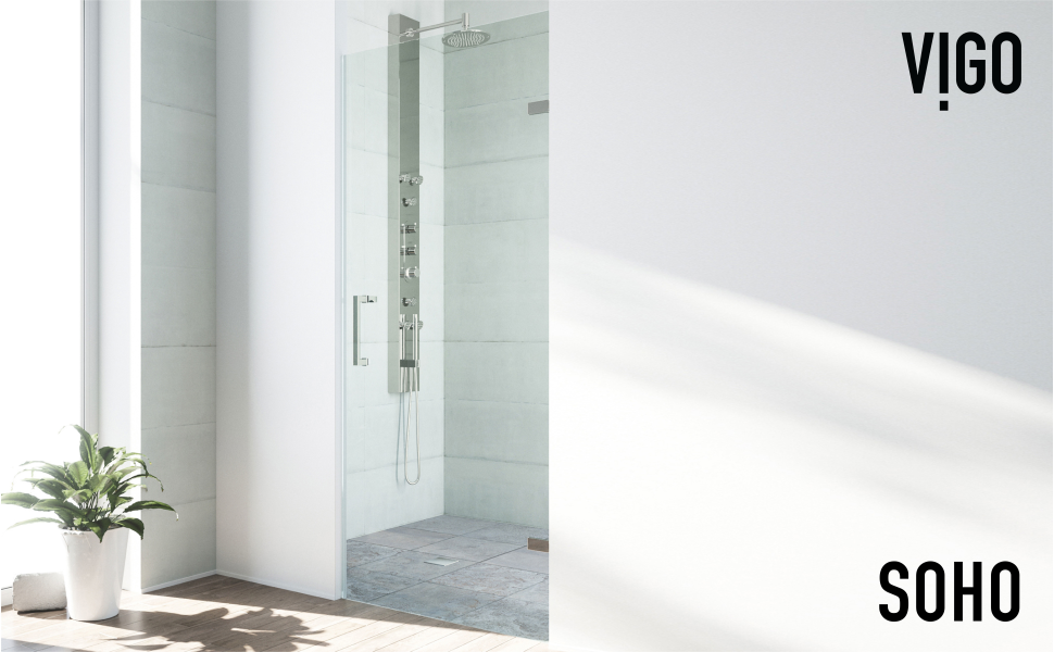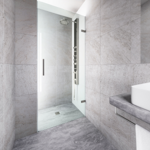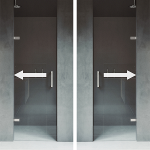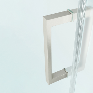 A square door handle and matching square hinges add visual dimension to this unique shower door.