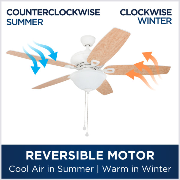 White ceiling fan from the Coastal Creek collection features 5 reversible blades in white and blonde finishes