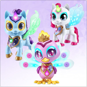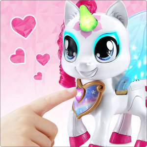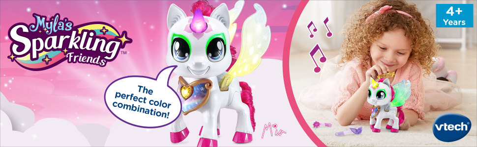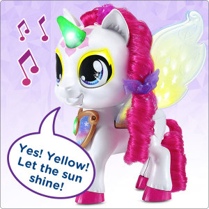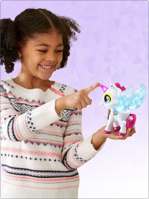 Mia talks, sings and lights up with a kaleidoscope of colors. Touch her necklace, horn, eyes and wings to change their color. Interact with Mia to hear 100+ responses about feelings, colors and more and sing a duet with her!