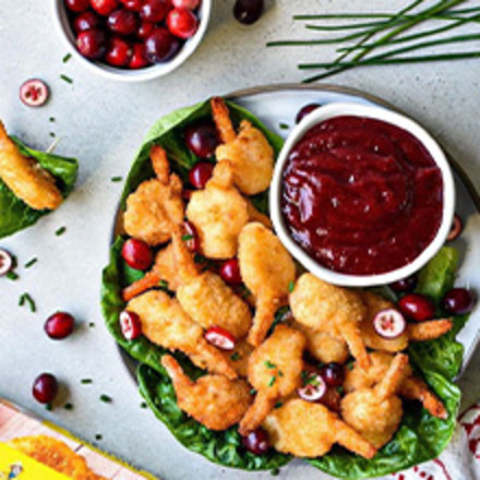 Looking for a simple way to excite your tastebuds? Pair your crispy shrimp with a tangy cranberry BBQ dipping sauce and a sprinkle of fresh chives.