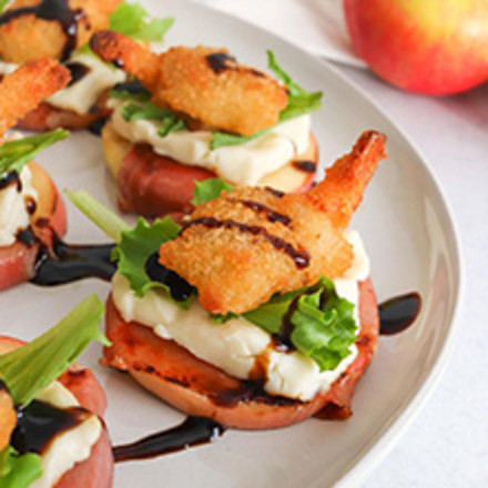 Impress your guests with an innovative pairing of crispy shrimp with decadent ingredients like soft brie, prosciutto, balsamic glaze, and a slice of honey crisp apple.