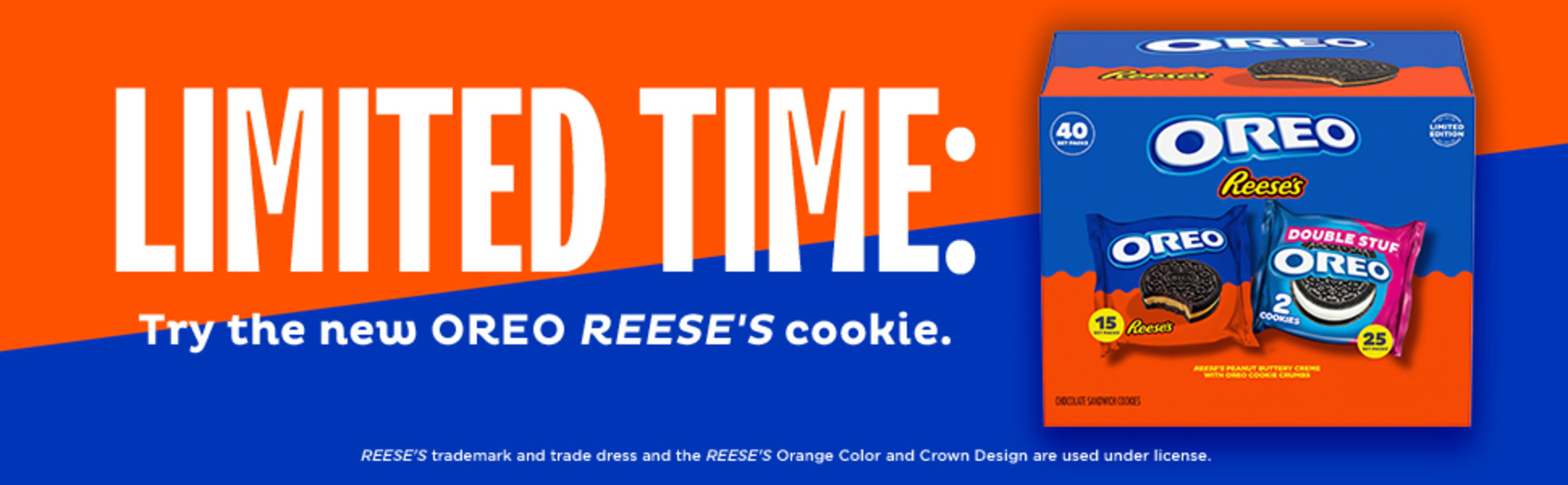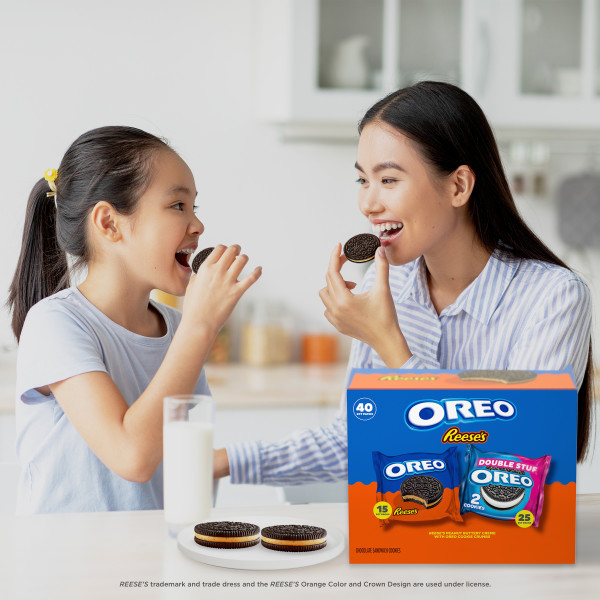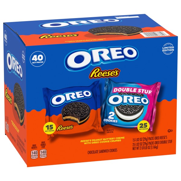 You asked for it! The iconic brands of OREO and REESE'S have collaborated to create one delicious treat, featured in the OREO REESE'S Peanut Buttery Creme and OREO Double Stuf Chocolate Sandwich Cookies Variety Pack. OREO REESE'S Peanut Buttery Creme snack cookies offer creme filling made with real REESE'S Peanut Butter sauce and OREO cookie crumb inclusions sandwiched between two signature OREO chocolate wafer cookies. This cookie mix pack includes OREO Double Stuf Chocolate Sandwich Cookies, stuffed with delicious OREO creme filling! The individually wrapped 2-cookie snack packs are great as after-lunch snacks, office snacks, and after-school snacks.