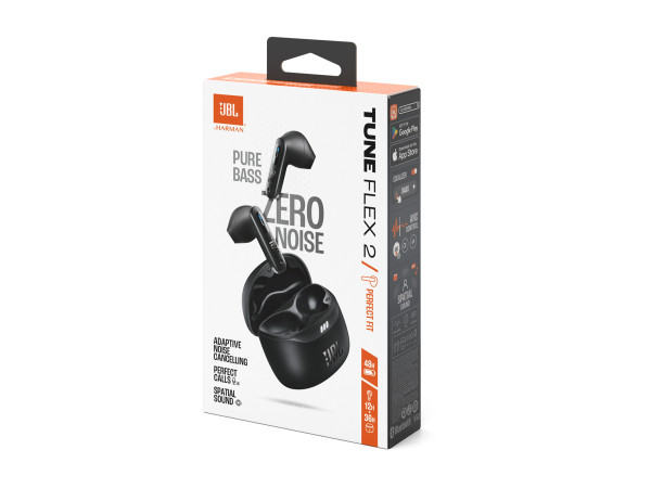 JBL Tune Flex 2 earbuds feature 12mm dynamic drivers that deliver powerful JBL Pure Bass sound. And whether you're listening to your favorite playlist, watching a movie, or playing a game, JBL Spatial Sound transforms the stereo sound from any source or device into a more immersive sound experience.
