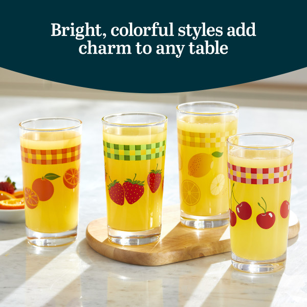Libbey Vintage Juice Glasses Drinking Set: Bring back the cozy, welcoming atmosphere of Mom or Grandma’s kitchen with the Libbey vintage juice glasses set. This charming glassware drinking glasses set includes four tall 11 ounce juice glasses. Crafted from quality glass, this textured drinking glasses set features a heavy base for stability and colorful fruit designs with a nostalgic gingham border. Each sip from these dinner glasses will transport you back to simpler times around the breakfast table. Relish the vintage charm every time you use these everyday drinking glasses set. These beverage glasses are ideal for everyday beverages like water and juice and perfect for serving tea or lemonade to guests, making every gathering feel special. The Libbey Vintage mixed drink glasses offer a modern twist on the classic decorated glass designs of the 60s and 70s. The bright, nostalgic styles add a mix-and-match appeal to your tabletop, enhancing your dining experience. Enjoy the convenience of easy cleaning with these dishwasher safe glasses. The colors remain vibrant even after multiple washes, although hand washing is recommended to preserve their beauty for years.