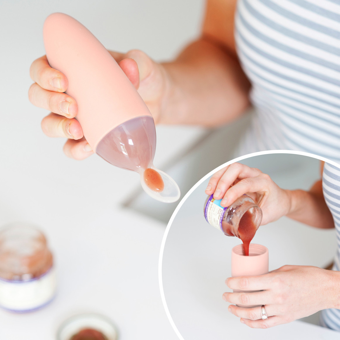 A simple squeeze provides the action, no more reaching for the baby food jar